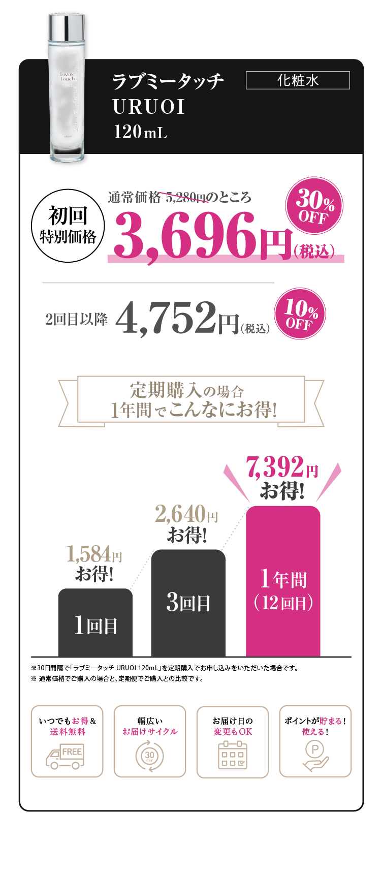 | 特徴 | 「ヒアルロン酸は肌に浸透しない」そんな常識を覆す、スーパー低分子ヒアルロン酸HA4を従来品の2倍配合。さらにハリ・年齢肌のケアに特化した機能性ペプチド10種や、うるおいを抱えて逃さない肌へ導く5種のヒト型セラミドも新たに配合。 大幅にパワーアップした”URUOI”で、うるおいに満ちたクリアな肌印象へ。 |