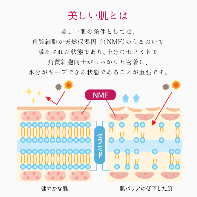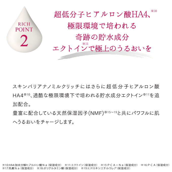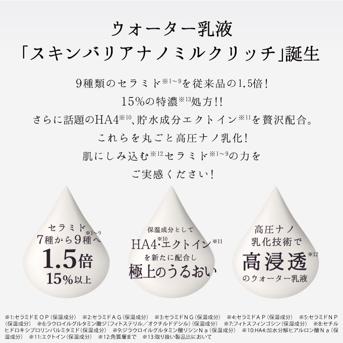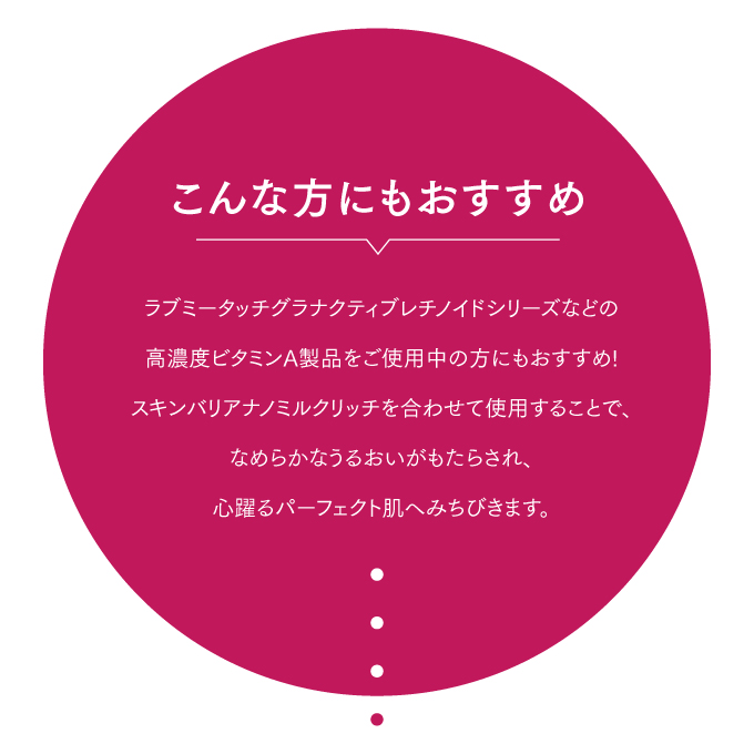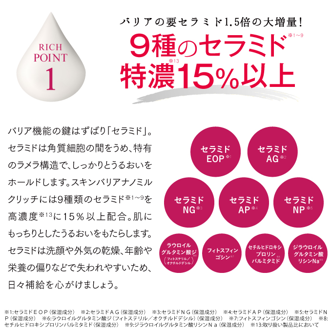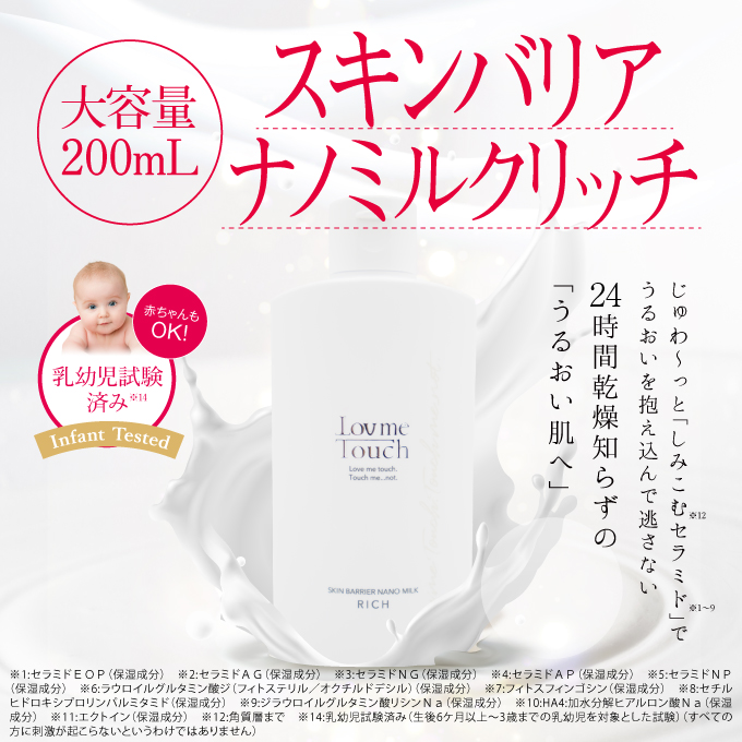 特徴 | lov me Touchシリーズにて不動の人気を誇るスキンバリアナノミルク リッチ。みなさまの声にお答えして大容量バージョンが登場! 保湿効果にすぐれた「セラミド(※1)」を従来品の1.5倍、15%以上配合した特濃(※2)処方。さらに話題の「HA4(※3)」や貯水成分「エクトイン(※4)」を贅沢配合することで極上のうるおいを抱え込み、肌バリアをサポートします。高圧ナノ乳化技術により高浸透(※5)を実現し、24時間乾燥知らずのうるおい肌へ導きます。ウォーター状でべたつかず、メイクの上からもご使用いただけます。 ※1 セラミドEOP、セラミドAG、セラミドNG,セラミドAP,セラミドNP、ラウロイルグルタミン酸ジ(フィトステリル/オクチドデシル)、フィトスフィンゴシン、セチルヒドロキシプロリンパルミタミド、ジラウロイルグルタミン酸リシンNa(整肌成分) ※2 取り扱い製品比において ※3 加水分解ヒアルロン酸(保湿成分) ※4 エクトイン(保湿成分) ※5 角質層まで |