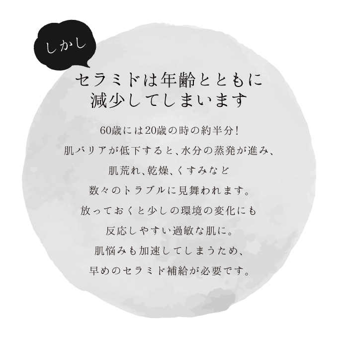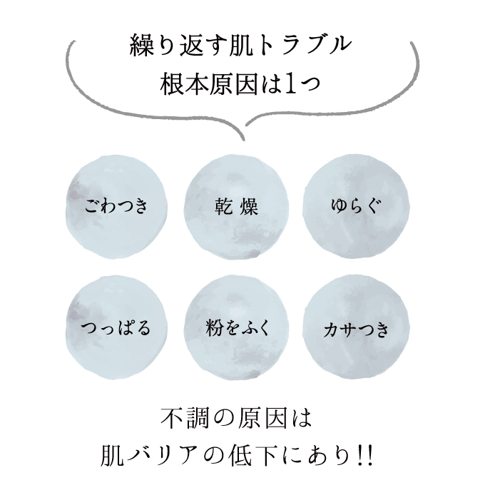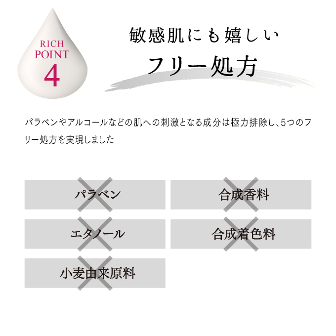 ご使用上の注意 | 1.お肌に異常が生じていないかよく注意して使用してください。化粧品がお肌に合わないとき即ち次のような場合には、使用を中止してください。そのまま化粧品類の使用を続けますと、症状を悪化させることがありますので、皮膚科専門医等にご相談されることをおすすめします。 (1)使用中、赤味、はれ、かゆみ、刺激、色抜け(白斑等)や黒ずみ等の異常があらわれた場合 (2)使用したお肌に、直接日光があたって上記のような異常があらわれた場合 2.傷やはれもの、しっしん等、異常のある部位にはお使いにならないでください。 3.目に入らないようご注意ください。目に入った場合はこすらず、すぐに水で洗い流してください。 |