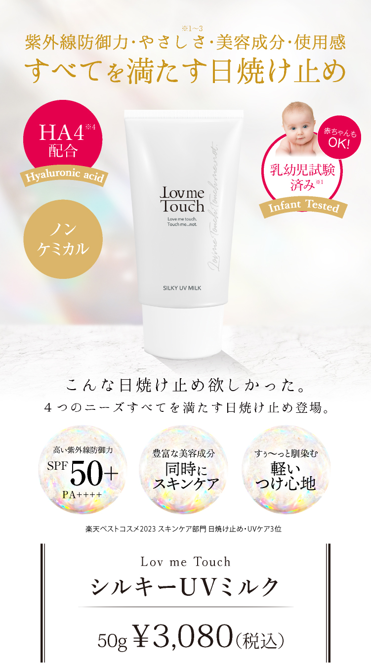 「高い紫外線防御力」「肌へのやさしさ」「ストレスのない使用感」「充実の美容成分」日焼け止めに欠かすことのできない4つのニーズ、全てにこだわり抜いた日焼け止めです。SPF50+ PA++++と高い数値でありながらも、紫外線吸収剤フリーで肌への負担を抑えたやさしい処方設計だから、赤ちゃんの肌にもご使用いただけます。保湿成分スーパー低分子ヒアルロン酸HA4(ヒアルロン酸Na)の他、群馬県碓氷産の最高品質シルクから抽出した成分「フィブロイン」、整肌成分フラーレン、セラミドなどを配合し、紫外線によるダメージから肌をまもります。軽いつけ心地で、真夏のレジャーだけでなく365日毎日の紫外線対策におすすめです。 ※乳幼児試験済み(生後6か月以上~3歳までの乳幼児を対象とした試験) (すべての方に刺激が起こらないというわけではありません) ※パッチテスト済み (すべての方に刺激が起こらないというわけではありません) ※ノンコメドジェニックテスト済み (すべての方にニキビができないというわけではありません) ※紫外線吸収剤フリー |