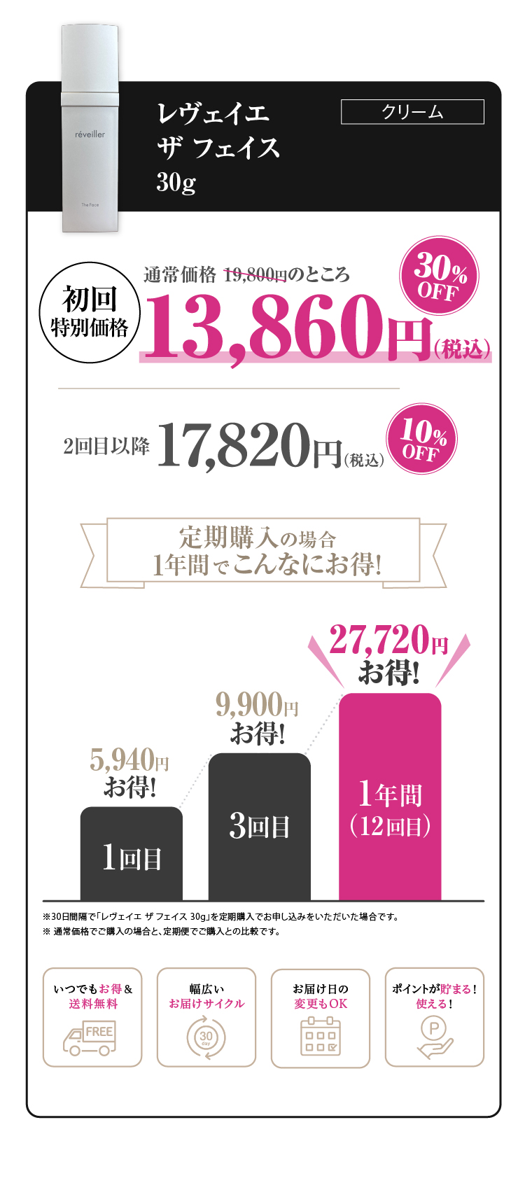 | ご使用方法 | 朝晩の洗顔後、化粧水等でお肌を整えた後、ディスペンサー2~3プッシュを目安に適量を手に取り、顔全体になじませてください。気になる部分にはさらに重ねづけしてください。 |
