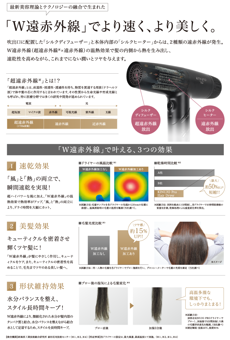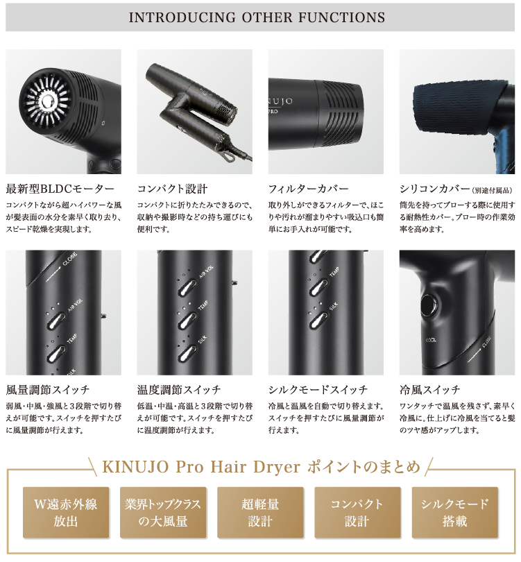 これまで使っていた他社のドライヤーでは毎回汗だくになってしまい、何のために洗髪したんだか…とうんざりしていましたが、KINUJOは本当にすぐ乾きます。風の温度が上がりすぎないのも良い。