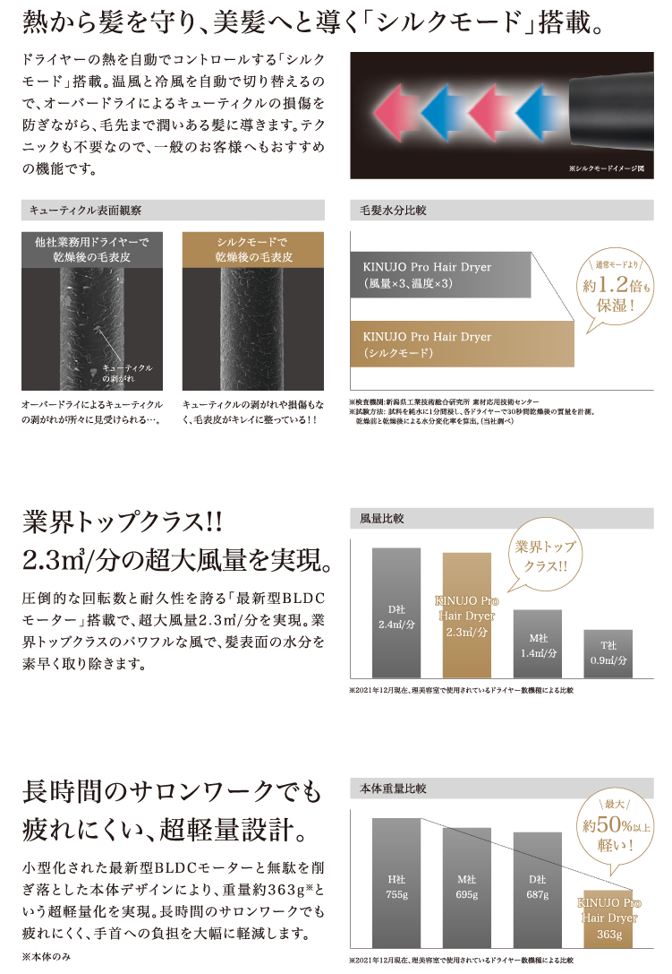 特徴 | 業界トップクラスの超大風量と軽量設計でドライ時間を最大50%短縮。最新機能「シルクモード」で速乾を叶えながら潤うツヤ髪を実現します。 |