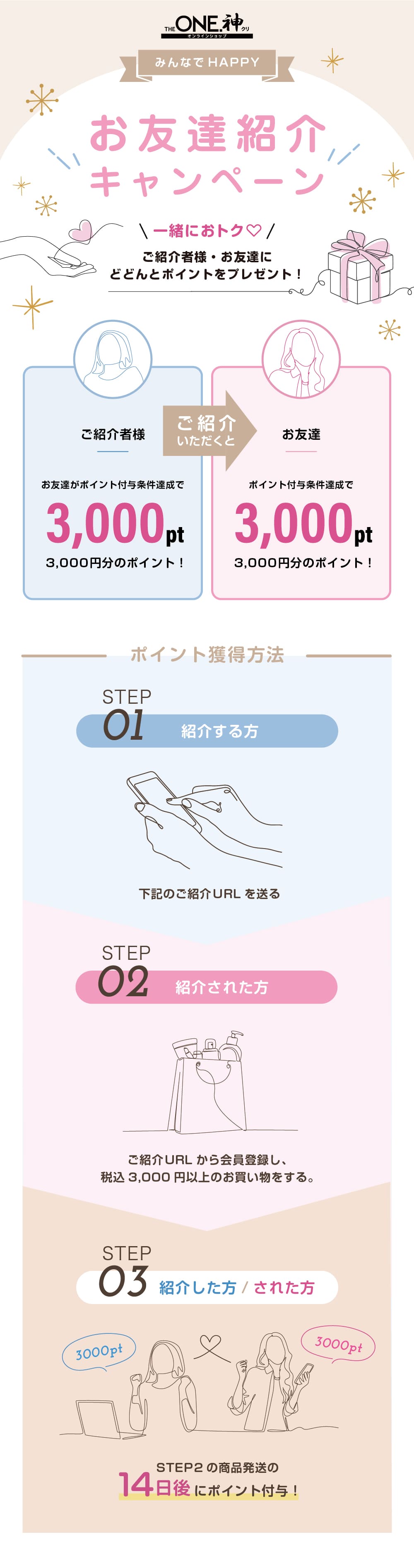 - ・ポイント付与には、キャンペーン期間内に紹介された方が1回のお買い物(決済)で商品代金合計税込3,000円以上のお買い物をする必要があります。
